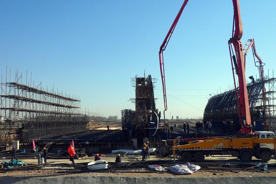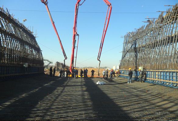 南水北調中線(xiàn)工程第八標段的渡槽工程自開(kāi)工建設以來(lái),克服了汛期、暴雨、施工難度大等眾多困難,于11月5日上午9:16分正式開(kāi)始澆筑。賈河渡槽單體槽深身凈寬13m,底板支座斷面厚1.15m,槽體高支座斷面為8.93m。渡槽結構復雜,施工難度大,為保證澆筑成功,圍繞首跨渡槽澆筑,項目部對主要人員進(jìn)行技術(shù)交底,將每項工序劃定責任到每位振搗人員、施工班長(cháng)、質(zhì)檢員身上,并制定24小時(shí)值班負責表。澆筑采用2臺泵車(chē)以分段分段層的順序,左右側混凝土對稱(chēng)下料,連續澆筑的方式進(jìn)行。經(jīng)過(guò)相關(guān)部門(mén)的緊密配合,于在11月6日凌晨4:17分順利完成了賈河渡槽第一跨右幅底板混凝土澆筑工作,為今后澆筑工作順利展開(kāi)做了充實(shí)準備。