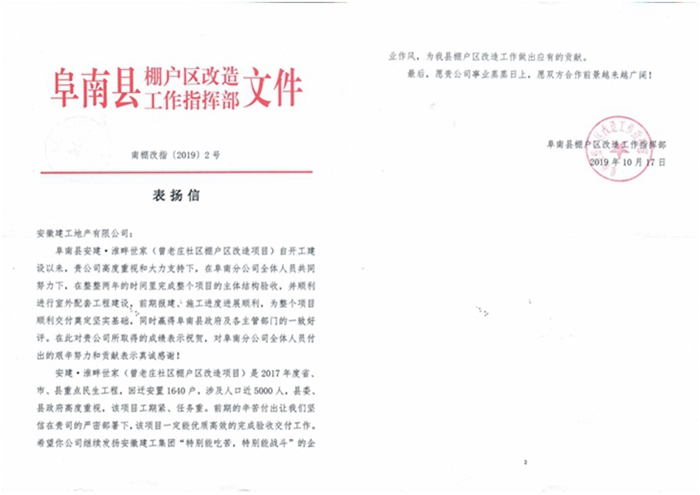 此次獲得阜南縣棚戶(hù)區改造工作指揮部表?yè)P,是阜南縣委、縣政府對安建地產(chǎn)的認可和肯定,對安建地產(chǎn)深耕阜陽(yáng)地區具有重要的意義,也為安建地產(chǎn)品牌樹(shù)立提供了堅實(shí)支撐。