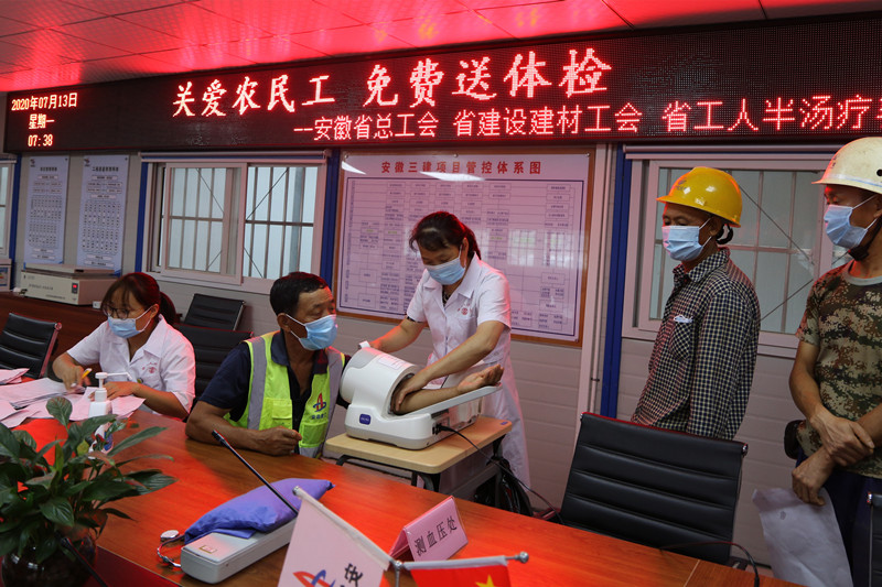 7月13日,由安徽省總工會(huì )組織,省建設建材工會(huì )、省工人半湯溫泉療養院承辦的“關(guān)愛(ài)農民工、免費送體檢”活動(dòng)來(lái)到了安徽三建合肥市中心圖書(shū)館項目,近120名現場(chǎng)農民工參加了體檢。