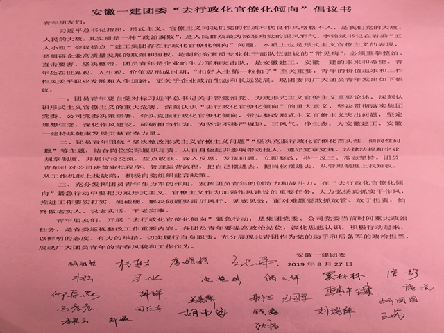 (四)在2019年的“去行政化官僚化傾向”的活動(dòng)中,團委組織青年倡議活動(dòng),團員青年嚴格要求自己,不搞形式主義、官僚主義并堅決抵制,大力弘揚真抓實(shí)干作風(fēng)。同時(shí)各團支部組織青年團員結合公司的實(shí)際、自己崗位職責,對公司的制度文件、審批流程、決策程序、管理制度等方面進(jìn)行討論交流并提出相關(guān)的意見(jiàn)建議。