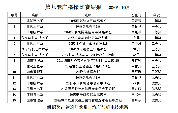 此次廣播操比賽,為各個(gè)班級搭建了團結、拼搏、健康、向上的平臺,既鍛煉了學(xué)生的體魄,又培養了學(xué)生的組織性和紀律性和集體榮譽(yù)感,增強了各班級凝聚力,充分展示了我院學(xué)生朝氣蓬勃和奮發(fā)向上的精神風(fēng)貌。