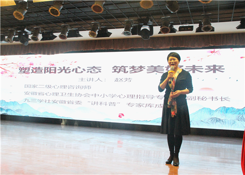 為進(jìn)一步提高我院學(xué)生心理健康意識,增強自我調節能力,營(yíng)造良好的心理健康氛圍,4月21日下午,學(xué)院邀請了著(zhù)名心理健康專(zhuān)家、安徽省心理衛生協(xié)會(huì )中小學(xué)心理專(zhuān)業(yè)指導委員會(huì )副秘書(shū)長(cháng)趙芳老師在學(xué)院大禮堂做題為“塑造陽(yáng)光心態(tài),筑夢(mèng)美好未來(lái)”心理健康專(zhuān)題講座。學(xué)院黨委委員、副院長(cháng)任建設、五系一部書(shū)記、學(xué)管人員、專(zhuān)兼職班主任、400余名學(xué)生代表參加了培訓。講座由院團委副書(shū)記桂萍主持。