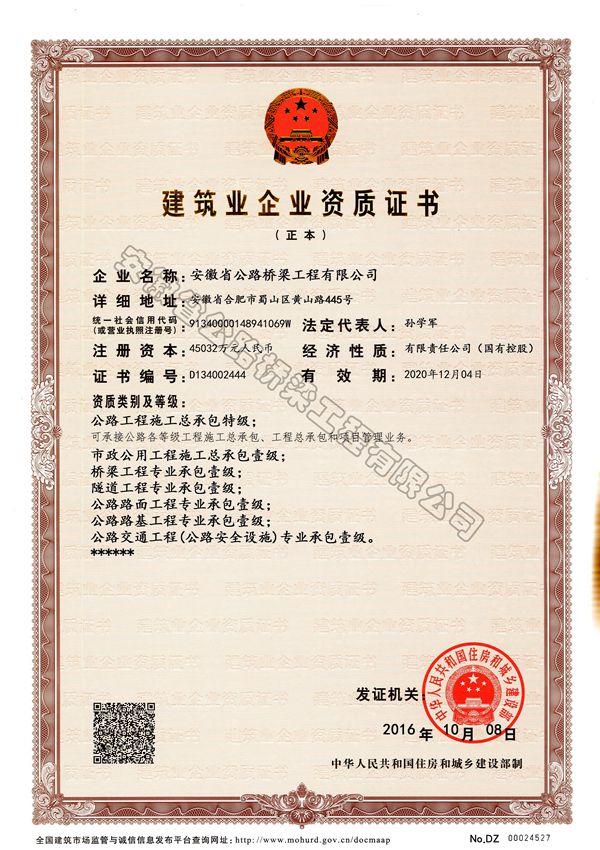 近日,住房和城鄉建設部發(fā)布公告,安徽路橋公司特級資質(zhì)順利獲批,成為安徽省內首家也是唯一一家同時(shí)擁有公路工程施工總承包特級資質(zhì)和公路行業(yè)工程設計甲級資質(zhì)的企業(yè)。