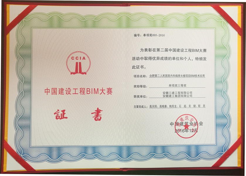 近日,第二屆中國建設工程BIM大賽結果揭曉,集團公司組織安徽三建、安徽建科完成的“合肥第二人民醫院內科病房大樓項目BIM技術(shù)應用”、“安徽省建筑科學(xué)研究設計院建筑檢測大廈BIM技術(shù)應用研究”分別獲得三等獎,為安徽省唯一獲獎本地施工企業(yè)。