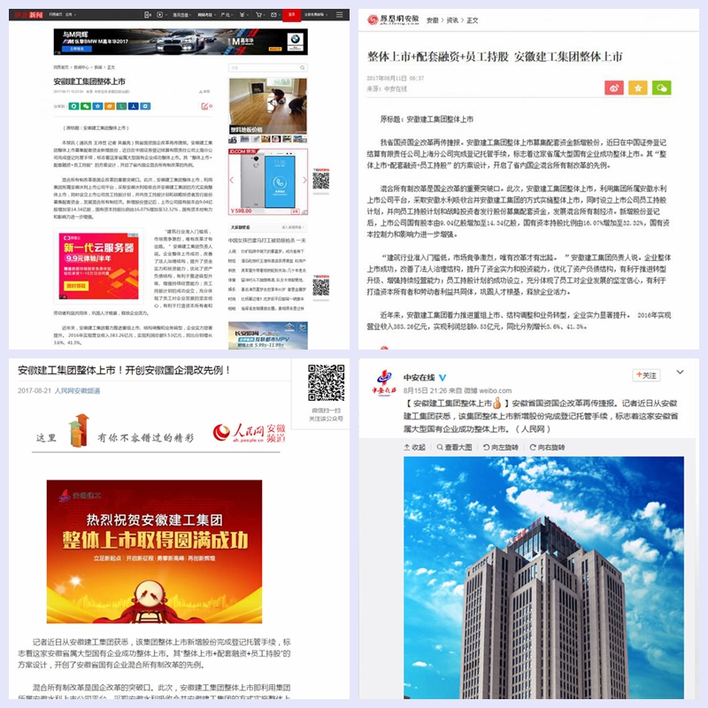 連日來(lái),安徽建工集團成功整體上市,引起社會(huì )各界強烈反響,受到中央、省市新聞媒體和網(wǎng)絡(luò )新媒體的廣泛關(guān)注。