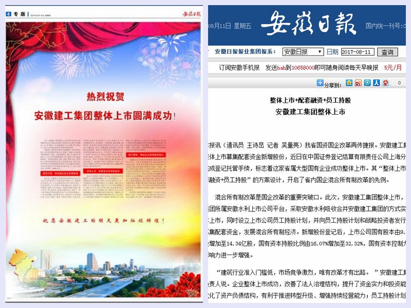 《安徽日報》以“整體上市+配套融資+員工持股,安徽建工集團整體上市”為題發(fā)布要聞消息,稱(chēng)集團整體上市一攬子方案設計,開(kāi)創(chuàng )了我省國企混合所有制改革的新范例。并推出整版專(zhuān)題報道《熱烈祝賀安徽建工集團整體上市圓滿(mǎn)成功》,從“轉型升級,傳統國企走出發(fā)展新路”、“改制上市,發(fā)展混合所有制經(jīng)濟”、“借力借智,推動(dòng)企業(yè)做強做優(yōu)做大”等方面,全面闡述集團整體上市的輝煌歷程和重大意義。