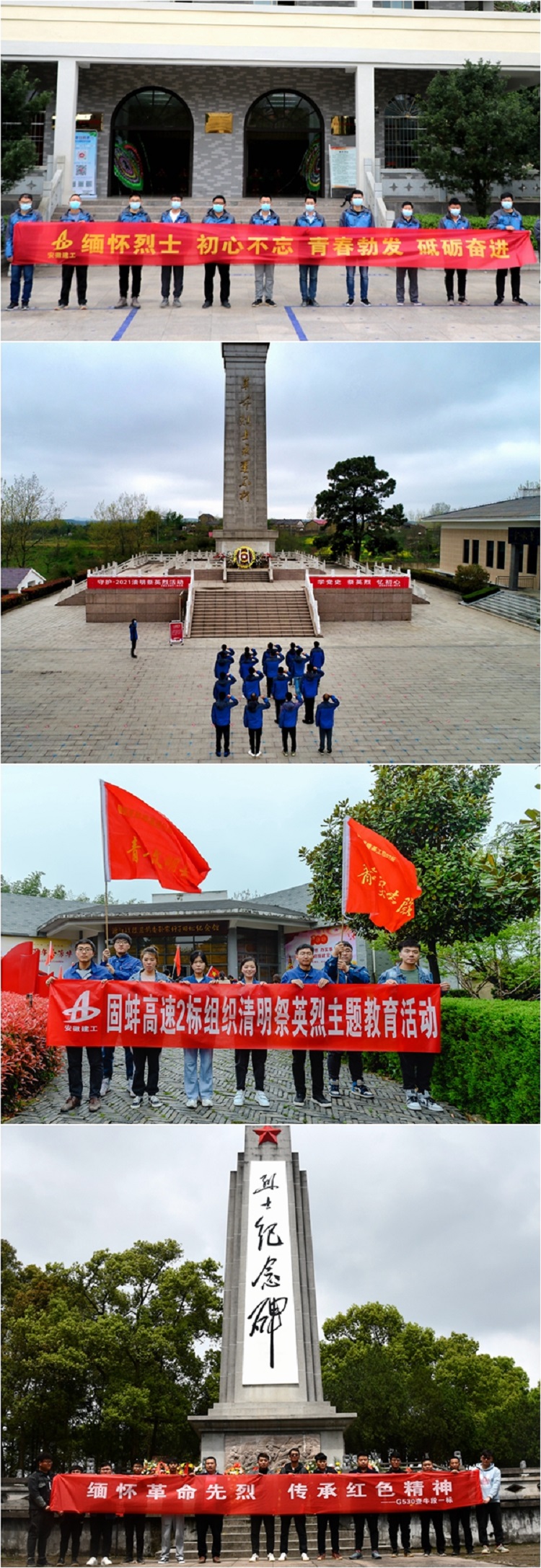 蒙城PPP項目黨支部組織黨員和職工來(lái)到蒙城縣革命烈士陵園掃墓祭奠,向革命烈士敬獻花籃,表達哀思;淮北片區黨支部組織黨員、團員青年和職工瞻仰泗縣烈士陵園,銘記歷史,致敬革命先烈;合肥軌道交通3號線(xiàn)南延2標項目黨支部前往新四軍江北指揮部開(kāi)展黨史教育,重溫入黨誓詞,牢記初心使命;引江濟淮聯(lián)合黨支部追尋紅色足跡,在茶壺山烈士陵園紀念碑前,唱響國歌,靜思默哀;暢通二環(huán)(西南環(huán))項目黨支部組織開(kāi)展“網(wǎng)上祭英烈”活動(dòng),廣大黨員、團員青年和職工登陸網(wǎng)上紀念館,緬懷革命先烈,表達對英雄的敬意。