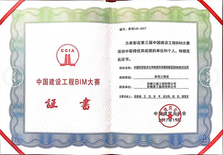 日前,由中國建筑協(xié)會(huì )主辦的建設工程BIM技術(shù)成果推廣應用經(jīng)驗交流會(huì )”在廈門(mén)召開(kāi)。會(huì )上對第三屆中國建設工程BIM大賽獲獎單位和個(gè)人頒發(fā)榮譽(yù)證書(shū)。集團公司組織安徽路橋完成的“BIM技術(shù)在特大型鋼管拱橋中的探索應用”獲得二等獎,組織安徽三建完成的“中國科學(xué)技術(shù)大學(xué)物質(zhì)科學(xué)教研樓項目BIM技術(shù)應用”獲得三等獎。