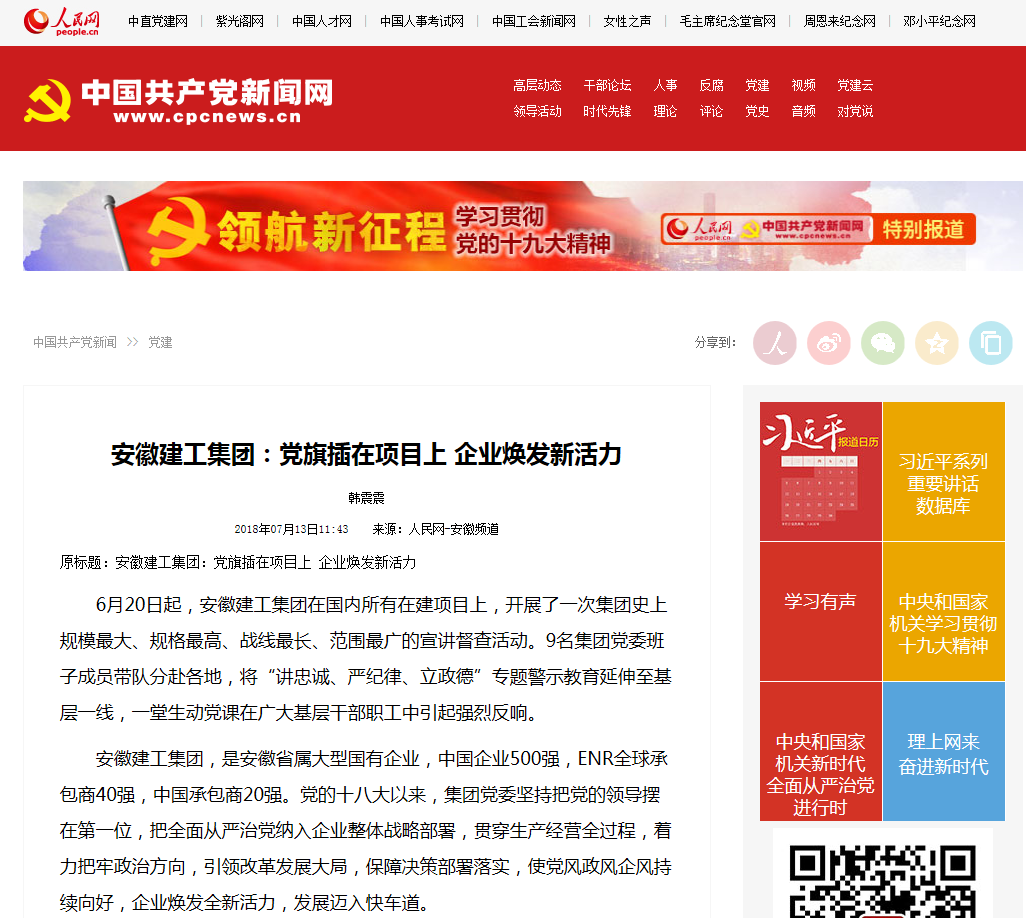 日前,安徽建工集團黨建工作受到中央主流新聞媒體重點(diǎn)宣傳,人民網(wǎng)、中國共產(chǎn)黨新聞網(wǎng)、人民網(wǎng)安徽頻道等以《安徽建工:黨旗插在項目上 企業(yè)煥發(fā)新活力》為題刊發(fā)記者專(zhuān)稿文章,點(diǎn)贊集團公司黨建工作。當天,該稿件在安徽省屬企業(yè)黨建網(wǎng)、人民網(wǎng)安徽頻道官方微信、安徽國資黨建官方微信以頭條同步刊出。