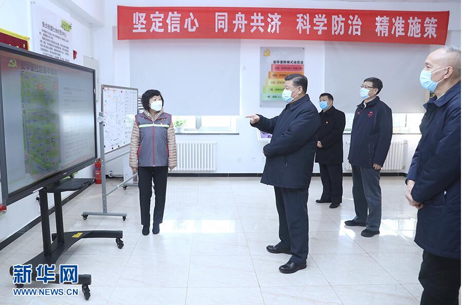 習近平首先來(lái)到北京市朝陽(yáng)區安貞街道安華里社區,了解基層一線(xiàn)疫情聯(lián)防聯(lián)控情況。在社區居民委員會(huì )疫情防控指揮部,習近平聽(tīng)取了安貞街道和安華里社區開(kāi)展聯(lián)防聯(lián)控情況介紹。習近平對社區采取多項措施,落實(shí)防控責任,實(shí)現入戶(hù)排查、重點(diǎn)群體監控“兩個(gè)全覆蓋”等做法表示肯定。他強調,社區是疫情聯(lián)防聯(lián)控的第一線(xiàn),也是外防輸入、內防擴散最有效的防線(xiàn)。把社區這道防線(xiàn)守住,就能有效切斷疫情擴散蔓延的渠道。全國都要充分發(fā)揮社區在疫情防控中的阻擊作用,把防控力量向社區下沉,加強社區各項防控措施的落實(shí),使所有社區成為疫情防控的堅強堡壘。要以疫情防控工作成效來(lái)檢驗和拓展“不忘初心、牢記使命”主題教育成果,發(fā)揮基層黨組織政治引領(lǐng)作用和黨員先鋒模范作用,把社區居民發(fā)動(dòng)起來(lái),構筑起疫情防控的人民防線(xiàn)。