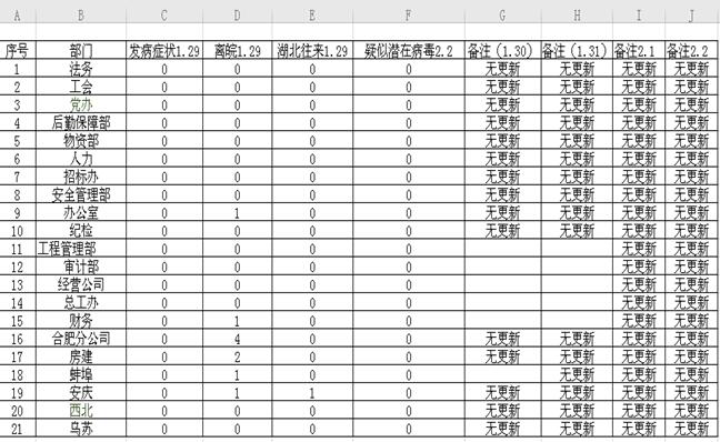 四是日報制度。自1月26日起實(shí)行日報制度,各分公司、各部門(mén)認真做好登記,確保信息及時(shí)準確,形成春節休假期間上下聯(lián)動(dòng)、聯(lián)防聯(lián)控的疫情防控工作格局。