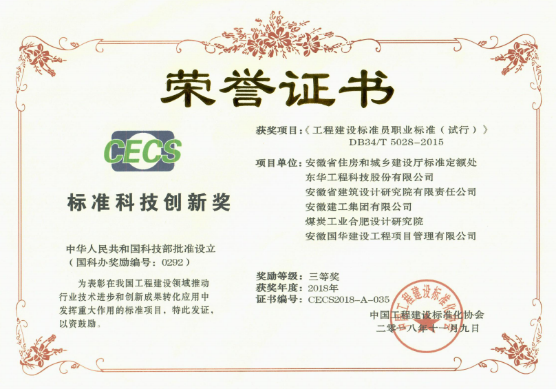 近日,根據《中國工程建設標準化協(xié)會(huì )關(guān)于標準科技創(chuàng )新獎評選結果的公告》(建標協(xié)函〔201853號),安徽建工集團聯(lián)合各單位主編完成的安徽省地方標準《工程建設標準員職業(yè)標準(試行)》(DB34/T 5028-2015)獲得了中國工程建設標準化協(xié)會(huì )的“標準科技創(chuàng )新獎”三等獎。