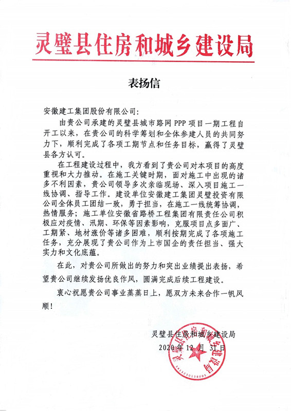 12月31日,靈璧縣住房和城鄉建設局向安徽建工集團股份有限公司發(fā)來(lái)表?yè)P信,高度贊揚了公司投資建設的靈璧縣城市路網(wǎng)PPP項目一期工程2020年取得的優(yōu)異成績(jì),充分肯定安徽建工的建設實(shí)力、責任擔當和良好企業(yè)形象。