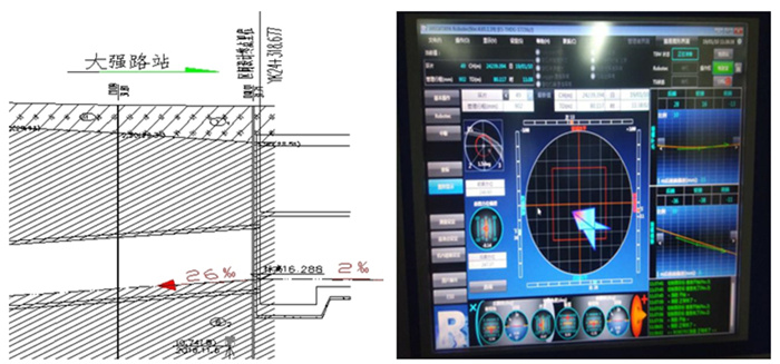 嚴控盾構始發(fā)姿態(tài)。盾構始發(fā)姿態(tài)決定了后續施工成敗,是盾構施工重中之重??紤]到盾構機自身重心靠前,始發(fā)掘進(jìn)時(shí)易產(chǎn)生向下的“磕頭”現象,項目部將盾構始發(fā)軸線(xiàn)比設計軸線(xiàn)抬高20mm。此外,因車(chē)站底板自西向東為2‰縱坡,盾構進(jìn)洞為26‰下坡。按照一般狀況抬高始發(fā)軸線(xiàn)易導致侵限。項目查找合肥市軌道交通前期其他盾構隧道施工的經(jīng)驗,結合大強路站地質(zhì)情況,調整盾構始發(fā)軸線(xiàn),將盾構始發(fā)軸線(xiàn)抬高改為5‰下坡,有效避免了盾構管片侵限。