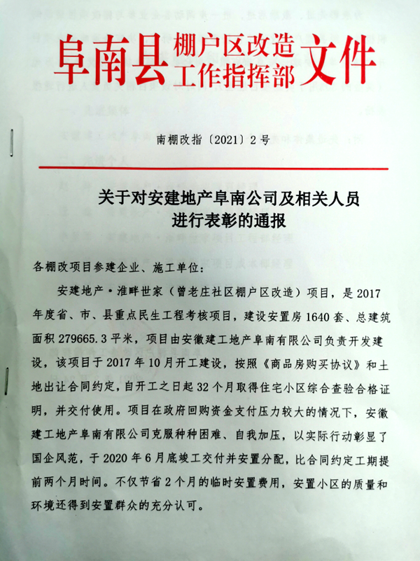 4月6日,由安建地產(chǎn)開(kāi)發(fā)建設的淮畔世家項目獲得阜南縣棚戶(hù)區改造工作指揮部全縣通報表彰,并獲得獎勵30萬(wàn)元。