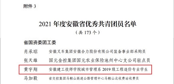 近日,共青團安徽省委作出關(guān)于表彰2021年度省優(yōu)秀共青團員的決定,授予173人“安徽省優(yōu)秀共青團員”稱(chēng)號。安徽建工技師學(xué)院城市管理系2019級工程造價(jià)三年高級班學(xué)生黃宇翔獲得此項榮譽(yù)。他用汗水編織未來(lái),用毅力成就夢(mèng)想,用拼搏鑄就輝煌,用實(shí)際行動(dòng)踐行“請黨放心,強國有我”的青春誓言。讓我們向榜樣學(xué)習,為他點(diǎn)贊。