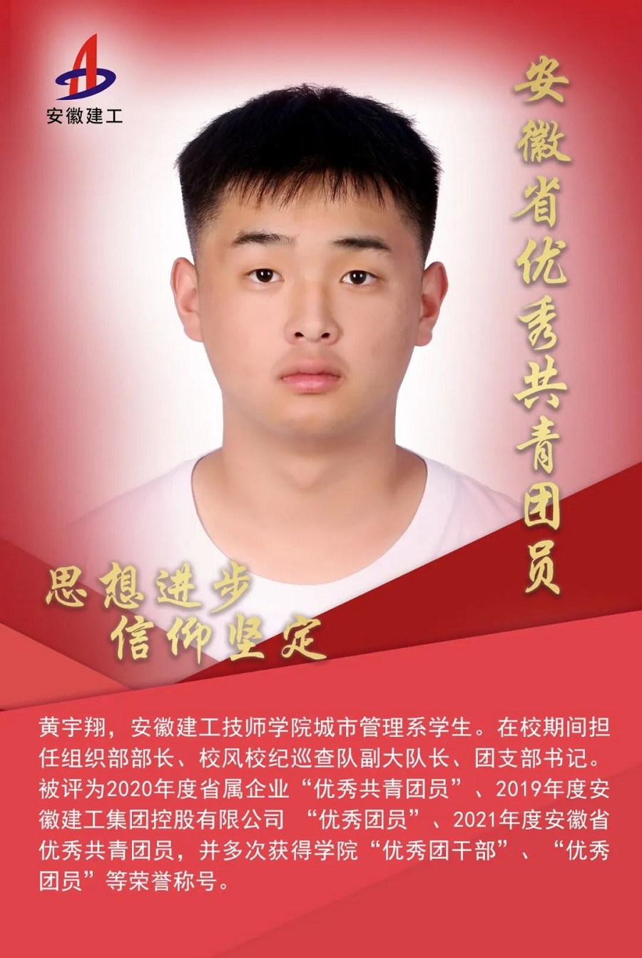 黃宇翔,男,漢族,2002年7月出生,共青團員,安徽建工技師學(xué)院城市管理系學(xué)生。在校期間擔任安徽建工技師學(xué)院城市管理系團總支組織部部長(cháng)、校風(fēng)校紀巡查隊副大隊長(cháng)、團支部書(shū)記。被評為2020年度省屬企業(yè)“優(yōu)秀共青團員”、2019年度安徽建工集團控股有限公司“優(yōu)秀團員”,并多次獲得學(xué)院“優(yōu)秀團干部”、“優(yōu)秀團員”等榮譽(yù)稱(chēng)號、獲校級二等獎學(xué)金和工程算量技能大賽優(yōu)勝獎。黃宇翔同學(xué)多次主動(dòng)參加新冠肺炎疫情防控工作,并積極參與2021年7月河南洪水的志愿救助工作,表現突出,志愿服務(wù)時(shí)數更是達到了近400小時(shí)。在同學(xué)眼中他是熱愛(ài)生活、積極向上的好朋友,在長(cháng)輩眼中,他是艱苦樸素、勤奮孝順的好孩子,在老師眼中他是認真工作、熱愛(ài)學(xué)習的好學(xué)生,更是廣大團員青年的好榜樣。