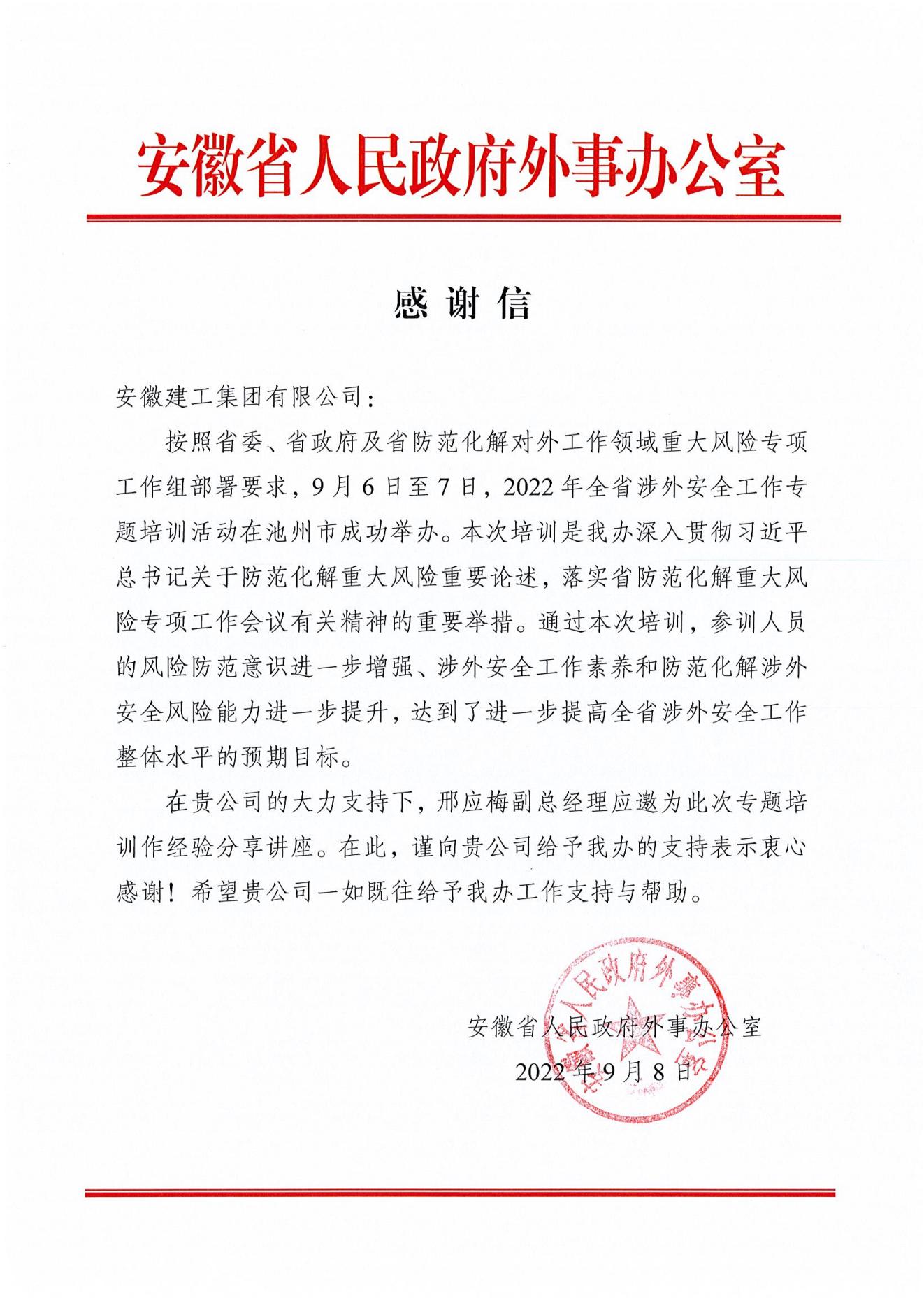近日,安徽省人民政府外事辦公室向安徽建工集團發(fā)來(lái)感謝信,對集團在全省涉外安全工作專(zhuān)題培訓活動(dòng)中給予的支持表示感謝。