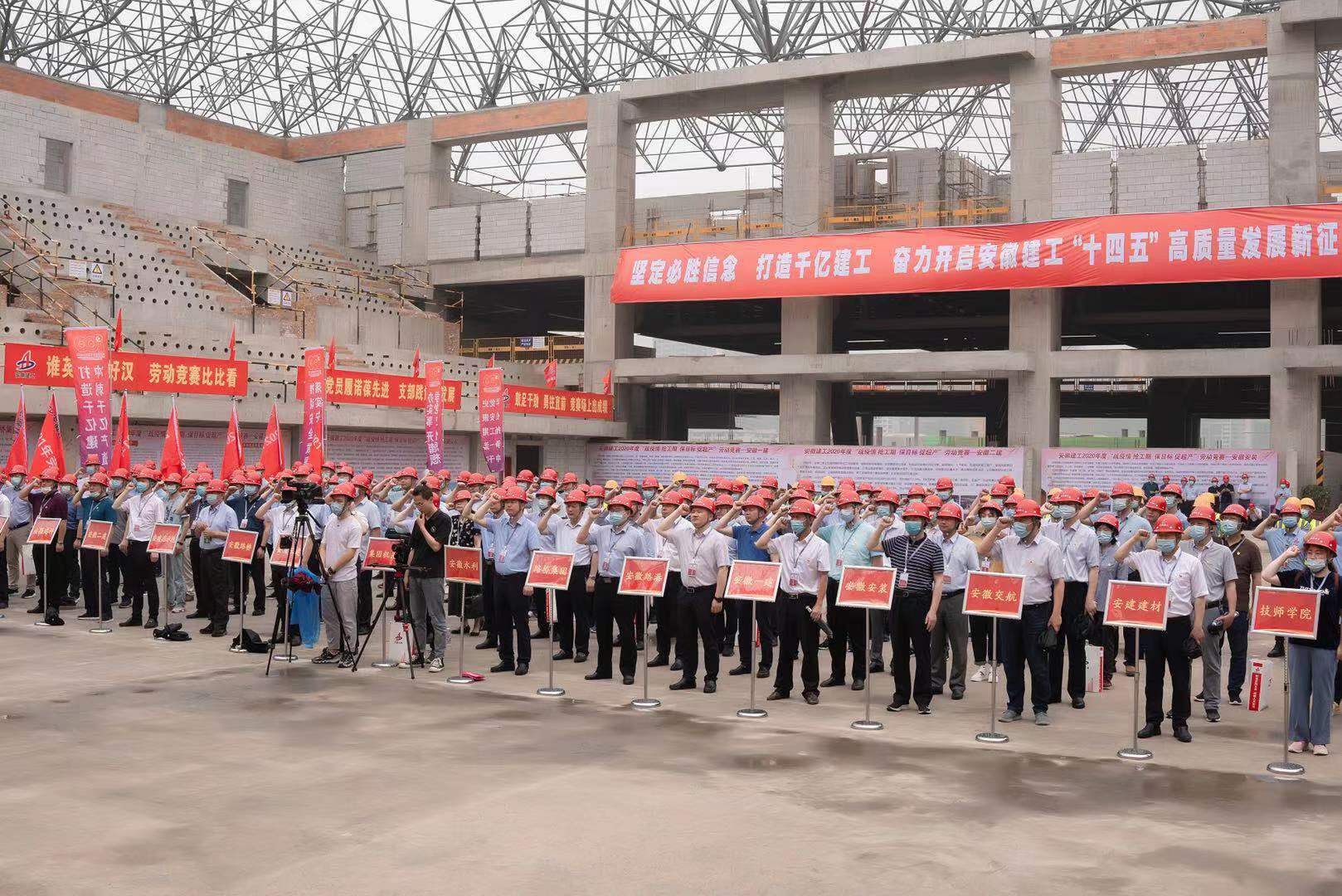 為隆重慶祝中國共產(chǎn)黨成立100周年,引導和激勵廣大黨員群眾更好地將黨史學(xué)習教育成果轉化為助力安徽建工高質(zhì)量發(fā)展的生動(dòng)實(shí)踐,快速掀起項目建設勞動(dòng)競賽熱潮,6月3日集團公司在安徽水利天長(cháng)高鐵核心區建設項目舉行2021年度勞動(dòng)競賽、“安全生產(chǎn)月”活動(dòng)啟動(dòng)儀式暨2020年度勞動(dòng)競賽總結表彰大會(huì )。省建設建材工會(huì )(廳文明辦)主任程德旺、天長(cháng)市副市長(cháng)楊瑞民等省市有關(guān)方面領(lǐng)導應邀出席啟動(dòng)儀式并講話(huà),建工控股黨委委員、股份黨委副書(shū)記、董事、總經(jīng)理許克順,股份黨委副書(shū)記、董事、副總經(jīng)理孫學(xué)軍,股份公司黨委委員、股份財務(wù)總監徐亮出席各項活動(dòng)并講話(huà)。建工股份勞動(dòng)競賽領(lǐng)導小組成員,所屬單位勞動(dòng)競賽委員會(huì )主任、分管生產(chǎn)安全負責同志、工會(huì )主席、安全科長(cháng),滁州片區項目經(jīng)理代表、受表彰優(yōu)勝項目部代表,以及安徽水利天長(cháng)高鐵核心區建設開(kāi)發(fā)項目管理團隊和施工班組等200余人參加儀式。