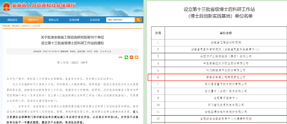 近日,安徽省人力和資源保障廳發(fā)布了《第十三批省級博士后科研工作站(博士后創(chuàng )新實(shí)踐基地)名單》(皖人社秘〔2022〕198號),集團所屬安徽省路港工程有限責任公司成功獲批省級博士后科研工作站,自此集團公司博士后工作站規模達3個(gè),標志著(zhù)集團公司在高水平科學(xué)研究、高層次人才培養方面又取得了重大突破。