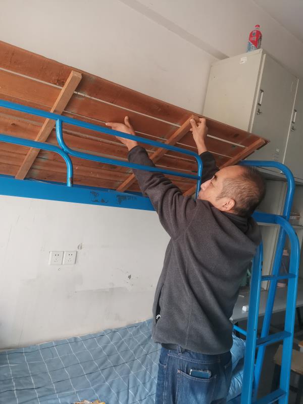 按照校園封閉管理統一部署,二百余名教職工和第三方員工住進(jìn)校園。宿管辦會(huì )同三系積極動(dòng)員在3號樓居住的女生搬遷到2號樓。不同班級、不同年級的女生要住到一起,搬遷阻力可想而知。在宿管辦和系部的不懈努力下,七十余名女教職員工順利住進(jìn)3號樓女生宿舍。男生宿舍樓雖也有空床位,但滿(mǎn)足不了男教職員工住宿需求。第三方住校的男員工有三十多人,綜合辦和物業(yè)打掃了兩大間空教室,宿管辦傾其所能為他們湊足了三十余張床板。第三方有部分員工被隔離在家,人手相對不足,住校員工十分辛苦,都希望晚上能睡個(gè)安穩覺(jué)。因為需要十多人住在一間教室里,難免相互影響睡眠,他們情緒很大,部分員工干脆在車(chē)上過(guò)夜,存在一定的安全隱患。安全保衛處遇到問(wèn)題不推諉、碰到困難不上交,做了大量細致的思想工作,對他們進(jìn)行耐心安撫,最終取得了他們的理解和支持,三十余名男員工住進(jìn)了教室。有幾對雙職工孩子年幼,需要有人照看。安全保衛處積極爭取政策,讓他們將孩子帶進(jìn)校園,既解決了他們的后顧之憂(yōu),又解決了食堂人手不足的燃眉之急。