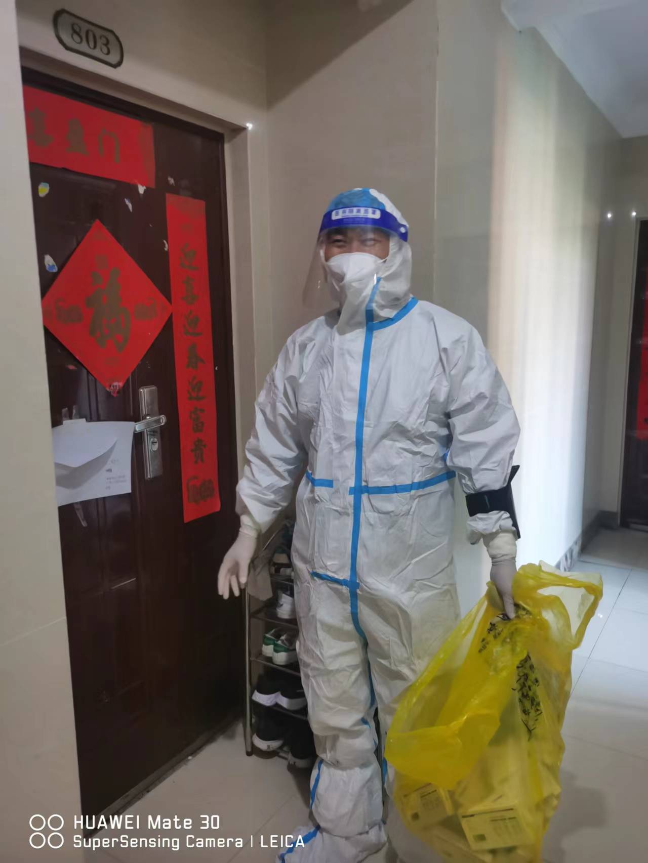 10月27日,合肥市濱湖區許多小區實(shí)行了封閉管理,社區工作人員工作量倍增,人手嚴重不足。得知情況后,八公司副經(jīng)理楊輝攜手妻子一起加入這場(chǎng)戰“疫”,作為團隊中年齡較大的志愿者,也是一名黨員,他主動(dòng)要求上門(mén)協(xié)助給業(yè)主做核酸取樣,分發(fā)抗原檢測試劑和生活物資,連續工作多天的他仍然保持著(zhù)高昂的工作熱情,在社區志愿者中廣受好評。