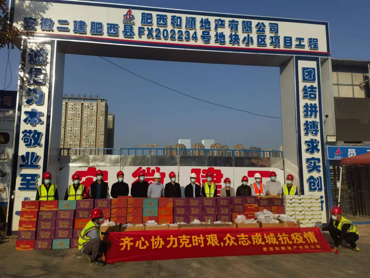 根據肥西縣疫情防控要求,為遏制疫情傳播,減少聚集性風(fēng)險,肥西縣所有在建項目全部停工并進(jìn)行封閉式管理。疫情就是命令,接到通知后,兩地塊10家參建單位300余人,即刻進(jìn)入封閉狀態(tài),為應對突發(fā)疫情管控要求,預防可能的存在的封控風(fēng)險,肥西和順公司組織采購了2萬(wàn)余元的防疫物資和食物,捐贈給各參建單位,一定程度上緩解了防疫物資配備不足的問(wèn)題,解決他們的后顧之憂(yōu),也增強了項目人員眾志成誠、共克時(shí)艱、戰勝疫情的強大動(dòng)力。