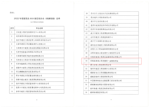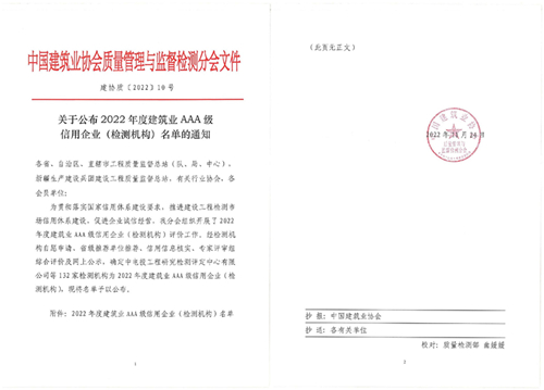 近日,從中國建筑業(yè)協(xié)會(huì )傳來(lái)喜訊,省質(zhì)檢二站成功獲評“2022年度中國建筑業(yè)AAA級信用企業(yè)(檢測機構)”。