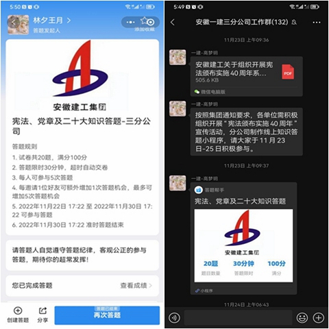 三分公司團支部制作憲法黨章及二十大知識答題小程序,以創(chuàng )新的方式方法讓黨的二十大精神入心入腦。與傳統的理論學(xué)習不同,掃描二維碼進(jìn)入小程序后,就能看到評比排行榜,員工平時(shí)工作休息之余,可以與好友互動(dòng)分享自己的“戰績(jì)”,發(fā)起“挑戰書(shū)”。教育對象在哪里,教育陣地就延伸到哪里,不同崗位的青年團員都可以參與進(jìn)來(lái)。開(kāi)發(fā)知識競賽小程序是一次運用網(wǎng)絡(luò )思維驅動(dòng)網(wǎng)絡(luò )載體的嘗試,使網(wǎng)絡(luò )這個(gè)“變量”,成為教育創(chuàng )新中的最大“增量”,推動(dòng)網(wǎng)上思想政治教育提質(zhì)增效。