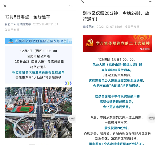 “合肥市人民政府發(fā)布”、“幸福肥東”、《合肥日報》、《安徽商報》等官方政務(wù)微信號、官方微信號對路橋集團建設成果予以報道展現。
