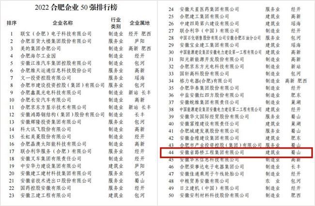 12月8日,合肥市企業(yè)(企業(yè)家)聯(lián)合會(huì )公布2022合肥企業(yè)50強榜單。安徽路橋集團憑借較強的綜合實(shí)力,入選“2022合肥企業(yè)50強”(排名44位),并位列“2022合肥建筑業(yè)企業(yè)20強”第10位。