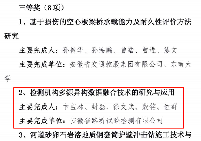 “安徽省公路學(xué)會(huì )交通科技進(jìn)步獎”是面向全省交通行業(yè)的科技獎項,第十屆交通科技進(jìn)步獎評審工作經(jīng)評審委員會(huì )按照相關(guān)規定和程序評審,共評選出獲獎項目38項。此次獲獎實(shí)現了檢測公司相關(guān)獎項零的突破。