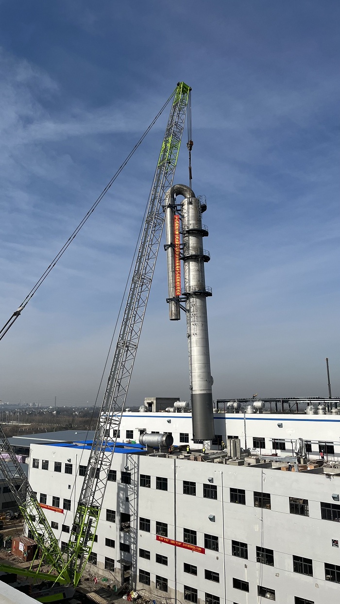 該精餾塔直徑為3.8米,總長(cháng)約為46米,連同爬梯、檢修平臺、附屬管道總重量約為100噸,設備基礎位于一樓地面0.2m上,坐落在丙交酯車(chē)間西南側,設備需要提升至3樓(21米)樓面再從預留洞落下就位。