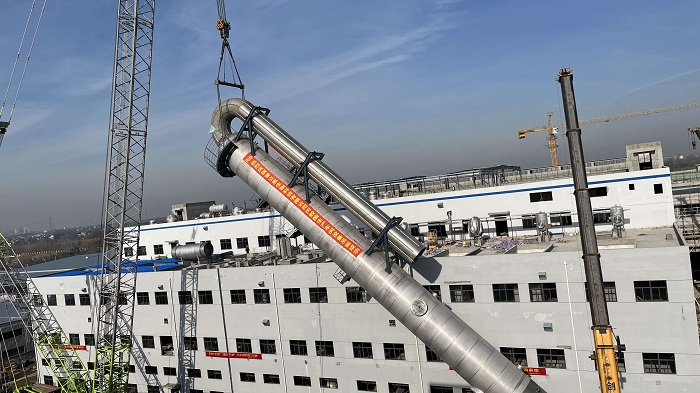 12月20日上午,安徽安裝合肥分公司承攬的蕪湖普立思生物科技有限公司聚乳酸及公用工程安裝項目丙交酯車(chē)間精餾塔一次性吊裝成功。