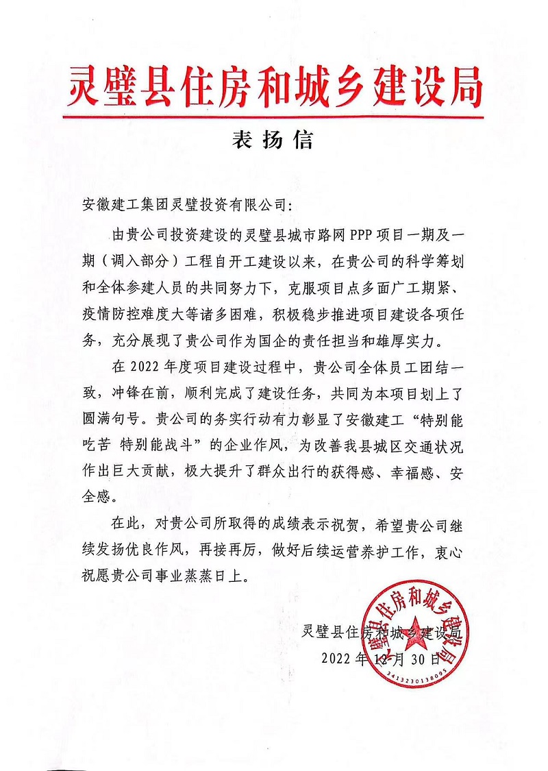 表?yè)P信中指出,靈璧縣城市路網(wǎng)ppp項目一期及一期調入部分工程自開(kāi)工建設以來(lái),項目公司科學(xué)籌劃、精心組織,項目全體參建人員團結一致,順利完成了所有建設任務(wù),為本項目劃上了圓滿(mǎn)句號,受到了當地群眾的一致認可和廣泛好評。
