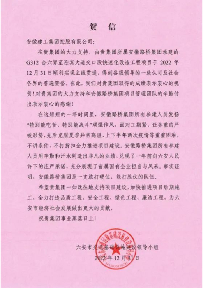 2022年12月31日,六安市交通基礎設施建設領(lǐng)導小組發(fā)來(lái)賀信,對安徽路橋集團承建的G312快速化改造工程在元旦前夕順利實(shí)現主線(xiàn)貫通表示熱烈祝賀!