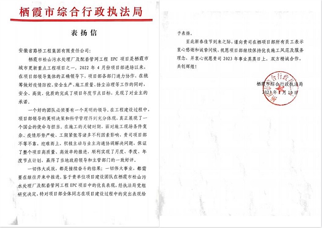 近日,安徽路橋集團所屬棲霞市新城區管網(wǎng)項目、山東松山污水處理廠(chǎng)項目、亳州至蒙城高速公路渦陽(yáng)(標里)至蒙城(雙澗)段混凝土構件集中預制02標項目、孫村園區新建龍沖東路/龍沖西路/經(jīng)二路及配套附屬工程項目先后獲來(lái)信表?yè)P。