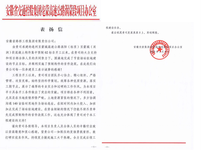 表?yè)P信中指出,公司領(lǐng)導的高度重視,精準指導和項目部團隊通力配合協(xié)作下,項目部克服施工現場(chǎng)條件復雜、工期緊張、疫情形式嚴峻等諸多不利因素影響,發(fā)揚“高效嚴謹,精細務(wù)實(shí)”的企業(yè)作風(fēng),攻堅克難,全力推動(dòng)工程建設,保質(zhì)保量完成施工任務(wù),贏(yíng)得了業(yè)主及市委、市政府領(lǐng)導的高度認可,對路橋集團在項目建設中給予的支持表示衷心的感謝。