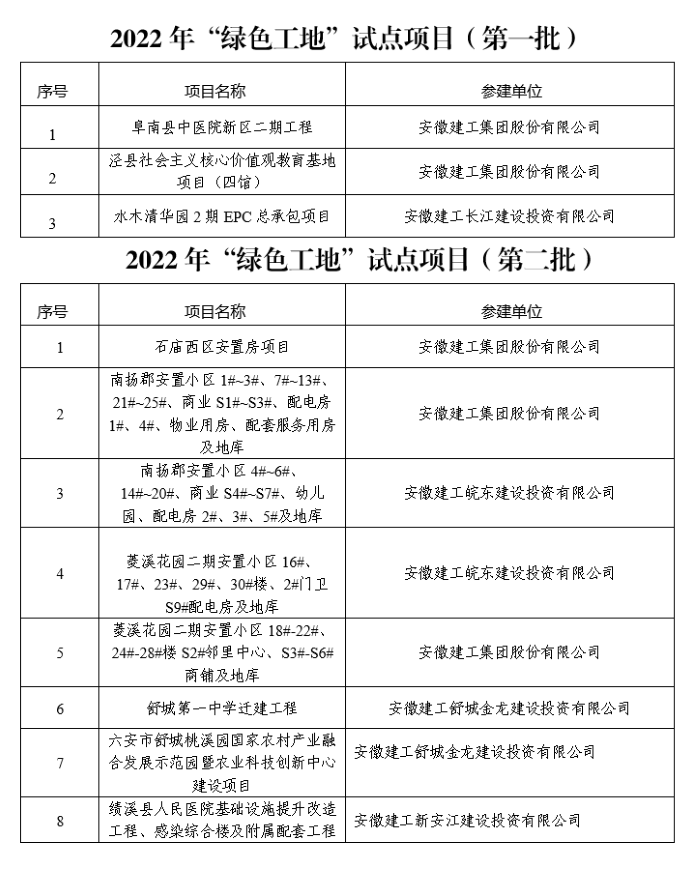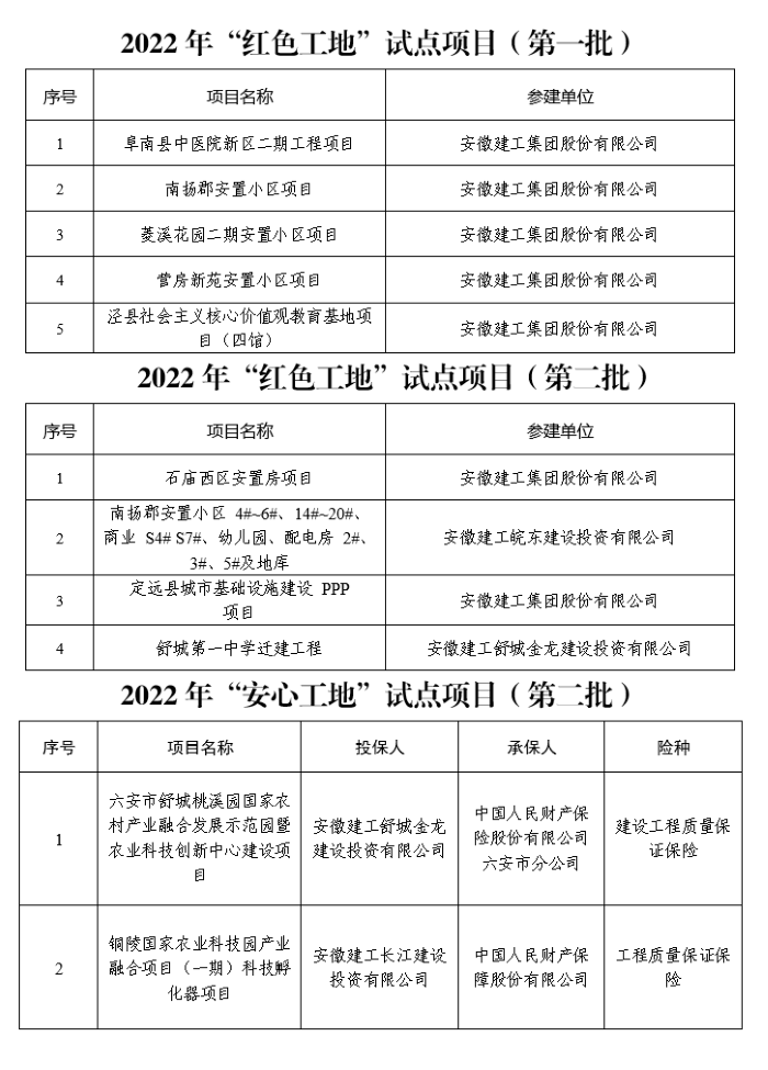 近日,安徽省住房和城鄉建設廳發(fā)布2022年“四個(gè)工地”(第二批)試點(diǎn)項目名單,安建總承包和多個(gè)政企合資公司承建項目21次獲評“紅色工地”、“綠色工地”、“智慧工地”、“安心工地”試點(diǎn)項目,加之2022年7月發(fā)布的第一批項目11次獲評,十多個(gè)項目累計32次獲評“四個(gè)工地”試點(diǎn)稱(chēng)號,其中舒城桃溪國家農村產(chǎn)業(yè)示范園EPC項目同時(shí)獲得“四個(gè)工地”試點(diǎn)稱(chēng)號。
