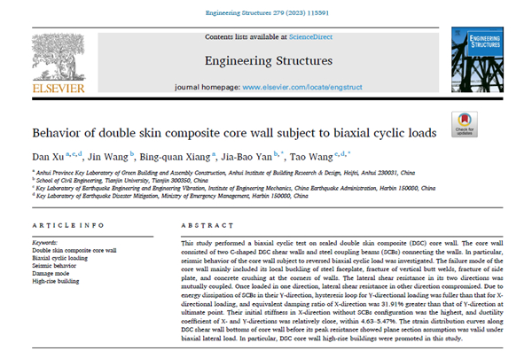 綠色建筑與裝配式建造安徽省重點(diǎn)實(shí)驗室結構與抗震課題組徐丹博士在結構工程領(lǐng)域國際著(zhù)名SCI期刊《Engineering Structures》(IF=5.582)上發(fā)表題為“Behavior of double skin composite core wall subject to biaxial cyclic loads”的論文,項炳泉正高工、王濤研究員和嚴加寶教授為論文的共同作者。該項工作得到了國家杰出青年基金、國家自然科學(xué)基金、黑龍江頭雁計劃和安徽省重點(diǎn)實(shí)驗室開(kāi)放基金等項目的資助。