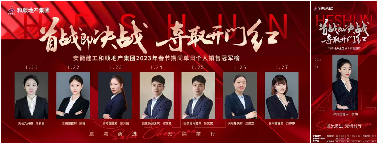 九州樾團隊節前啟動(dòng)前期意向客戶(hù)解籌工作,第一時(shí)間梳理意向客戶(hù),大年三十全員在崗,通過(guò)現場(chǎng)氛圍包裝、年俗活動(dòng),全力約訪(fǎng)意向客戶(hù)到訪(fǎng)。滁州和順國樾府及九州樾團隊通力合作、勠力同心,以更加昂揚的奮斗姿態(tài)和更飽滿(mǎn)的精神風(fēng)貌投入工作中,喜報頻傳:2023年和順地產(chǎn)春節期間單日個(gè)人銷(xiāo)售冠軍榜7位冠軍強勢占位3席、團隊銷(xiāo)售冠軍占位2席,初七開(kāi)工首日銷(xiāo)冠依然花落滁州,真正實(shí)現“首戰即決戰 奪取開(kāi)門(mén)紅”!