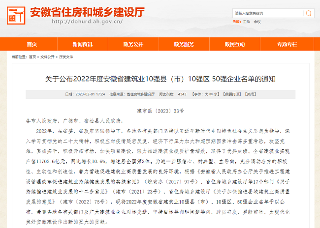 近日,省住房和城鄉建設廳公布《2022年度安徽省建筑業(yè)50強企業(yè)名單》,安徽路橋集團再次榮登榜單,位列第16位,較上一年度上升5位。合肥市蜀山區召開(kāi)高質(zhì)量發(fā)展暨“一改兩為”推進(jìn)大會(huì ),公布了“2022年蜀山區建筑業(yè)十強企業(yè)”榜單,安徽路橋集團再次入選。頻獲殊榮,標志著(zhù)公司綜合實(shí)力、行業(yè)競爭力、品牌影響力的再次提升。
