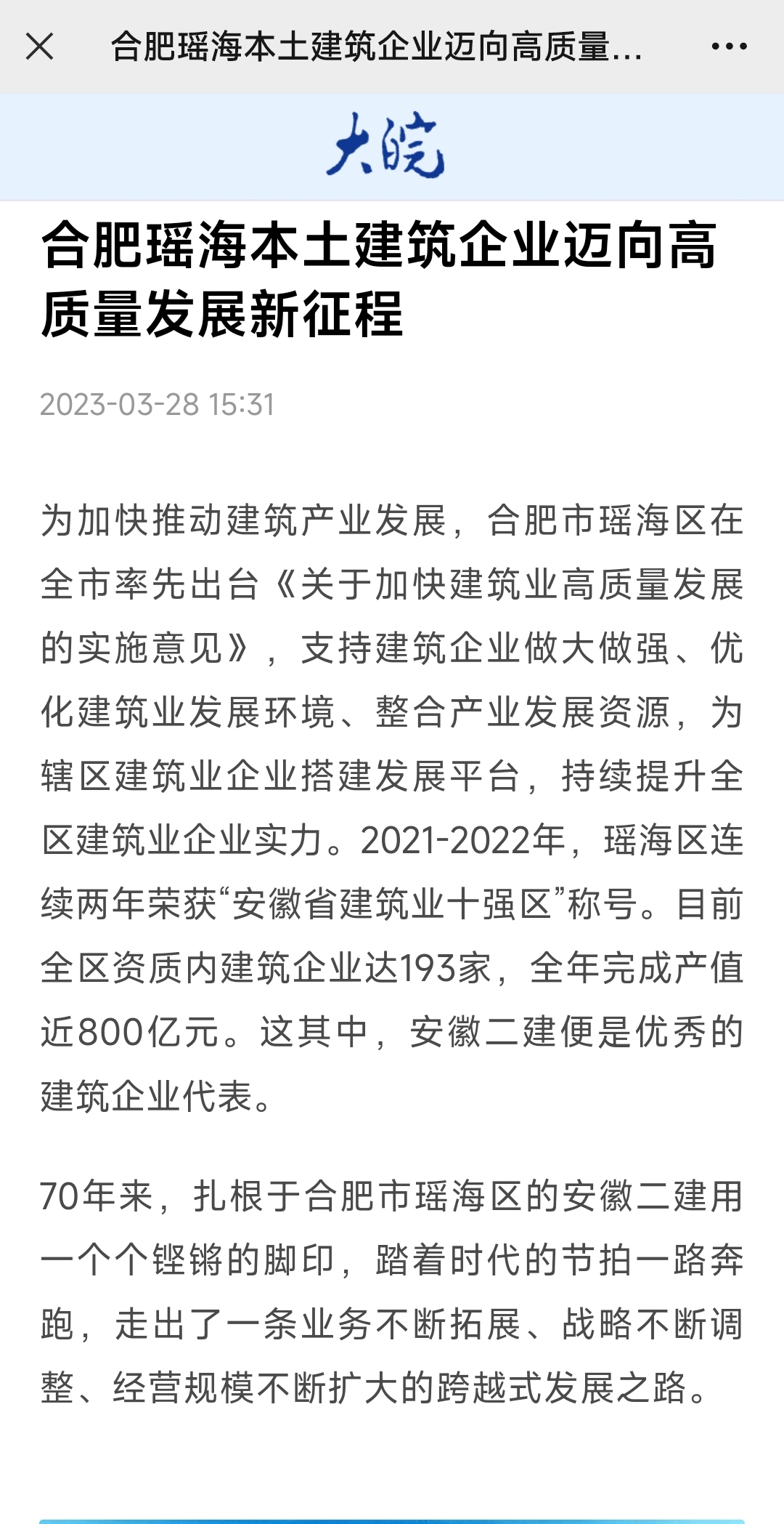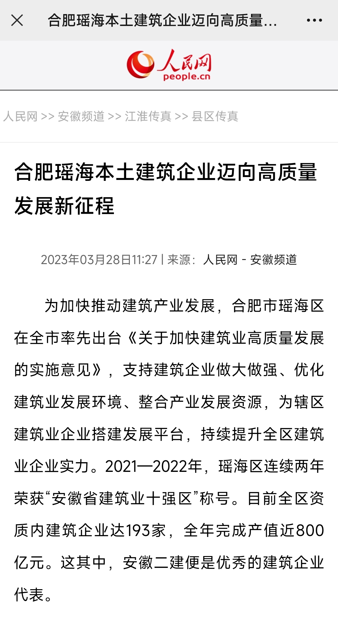 3月28日,人民網(wǎng)安徽頻道、中國日報網(wǎng)、安徽日報、大皖新聞等權威主流媒體相繼報道安徽二建公司建企70周年發(fā)展成就,滿(mǎn)懷信心邁向高質(zhì)量發(fā)展新征程。