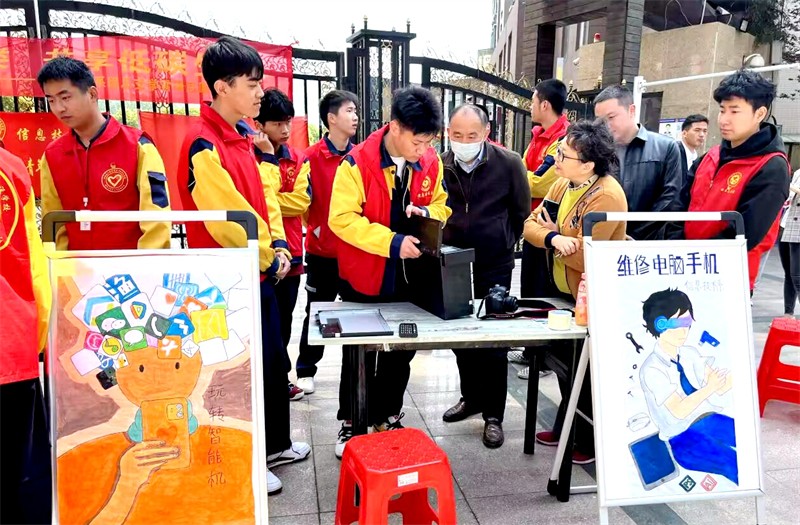 儀式結束后,學(xué)院志愿者協(xié)會(huì )的小志愿者們赴望湖街道民航家園小區,結合所學(xué)專(zhuān)業(yè),開(kāi)展了手機電腦基礎檢查與維修、垃圾分類(lèi)宣傳、助老玩轉智能手機等志愿服務(wù)活動(dòng),以實(shí)際行動(dòng)為群眾辦好事、辦實(shí)事,受到社區居民們的一致贊揚。