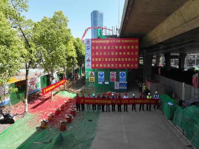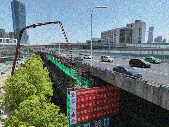 在金寨路高架橋綁寬項目,工人們正在進(jìn)行首聯(lián)預應力混凝土箱梁澆筑,標志著(zhù)項目正式進(jìn)入高架橋上部結構施工階段。