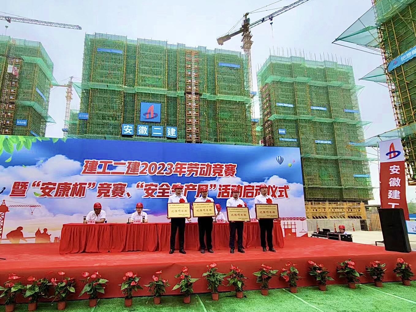5月30日上午,建工二建在蕪湖中丞濱江時(shí)代項目現場(chǎng)舉行2023年勞動(dòng)競賽暨“安康杯”競賽、“安全生產(chǎn)月”活動(dòng)啟動(dòng)儀式。公司領(lǐng)導班子成員,勞動(dòng)競賽委員會(huì )成員,所屬各單位主要領(lǐng)導,分管安全、生產(chǎn)及質(zhì)量副經(jīng)理,工會(huì )(副)主席,工管科、安全科科長(cháng),公司工會(huì )、工程管理部、安全管理部、技術(shù)質(zhì)量部相關(guān)人員,受表彰先進(jìn)集體和個(gè)人代表等共百余人參加本次活動(dòng),公司黨委副書(shū)記、工會(huì )主席王軍主持啟動(dòng)儀式。