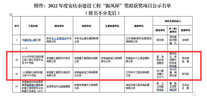 近日,2022年度安慶市建設工程“振風(fēng)杯”獎項獲獎項目名單正式公示,由安徽建工投資建設的懷寧S238二期PPP項目、太湖G105PPP項目經(jīng)安慶市住房和城鄉建設局審定,榮獲2022年度安慶市建設工程“振風(fēng)杯”獎。
