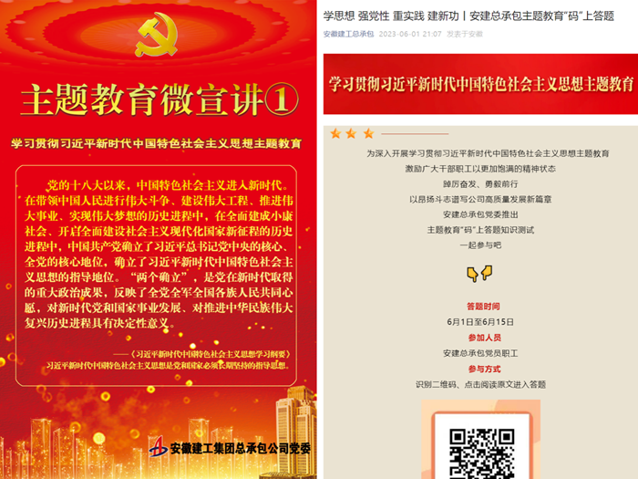 “怎么實(shí)現全黨思想、意志、行動(dòng)的統一?最根本的就是用黨的基本理論武裝全黨?!睂W(xué)習貫徹習近平新時(shí)代中國特色社會(huì )主義思想主題教育開(kāi)展以來(lái),安建總承包黨委牢牢把握“學(xué)思想、強黨性、重實(shí)踐、建新功”總體要求,緊緊錨定主題教育目標任務(wù),堅決貫徹落實(shí)習近平總書(shū)記關(guān)于主題教育一系列重要指示批示精神,緊密結合公司深化改革、轉型升級實(shí)際,以?shī)^進(jìn)姿態(tài)推動(dòng)主題教育扎實(shí)開(kāi)展。