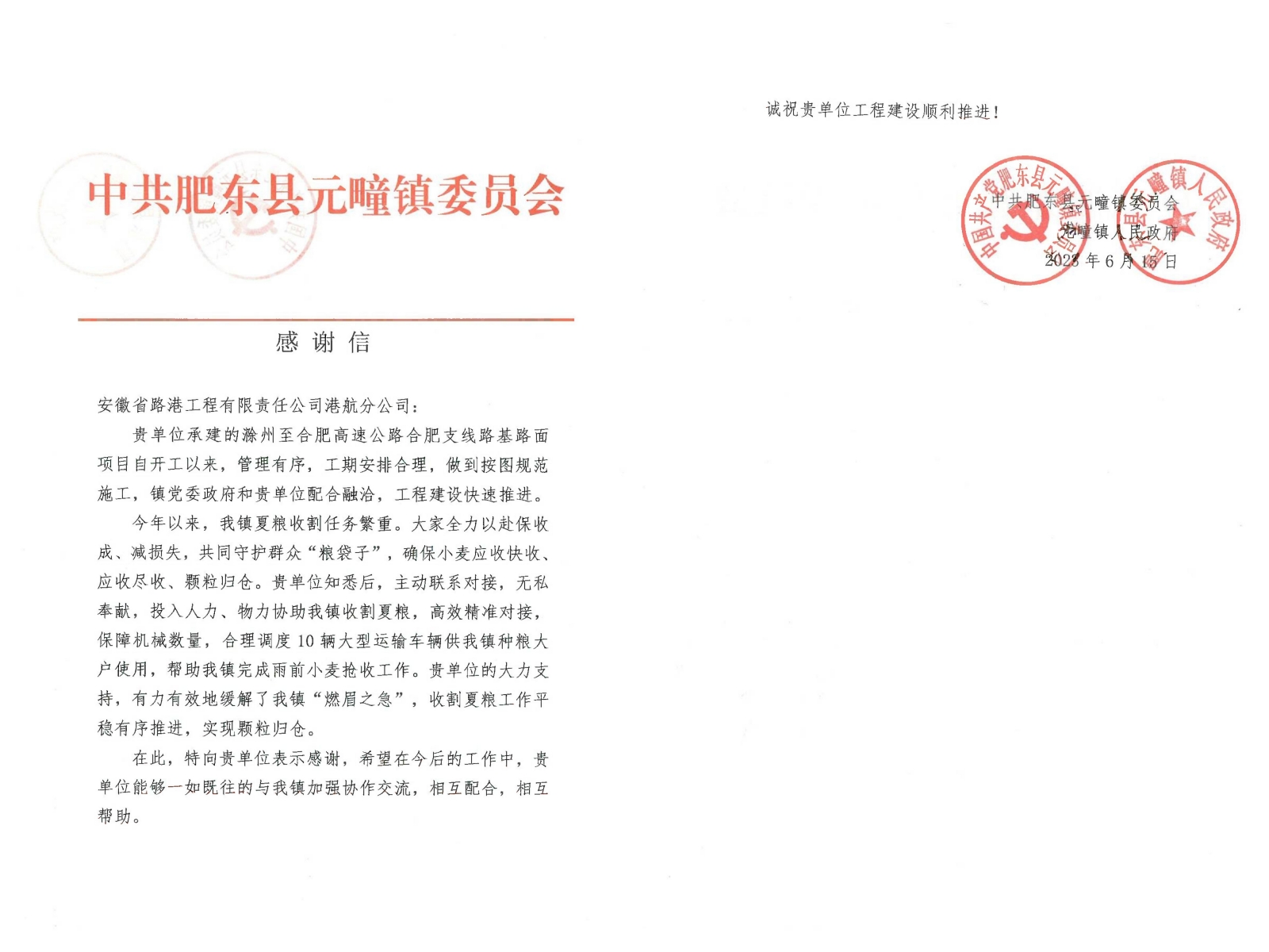 近日,建工路港滁河支線(xiàn)項目部收到中國共產(chǎn)黨肥東縣元疃鎮委員會(huì )、肥東縣元疃鎮人民政府感謝信,對項目部在當地夏糧收割過(guò)程中所給予的幫助表示感謝。