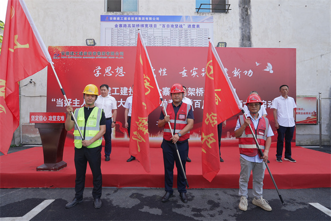 紅色七月承初心,蓄力大干踐使命。為加快項目建設,踐行主題教育,奮力譜寫(xiě)企業(yè)高質(zhì)量發(fā)展新篇章,2023年7月11日上午9時(shí),建工建投集團金寨路高架橋綁寬項目舉行“當好主人翁 建功大發(fā)展”勞動(dòng)競賽暨“百日攻堅”誓師大會(huì )啟動(dòng)儀式。公司黨委書(shū)記、董事長(cháng)任杰,黨委委員、副總經(jīng)理、總工程師陳莘,黨委委員、副總經(jīng)理王秋華等出席活動(dòng),安建交建公司班子成員參加活動(dòng),啟動(dòng)儀式由安建交建公司黨支部書(shū)記劉韌主持。